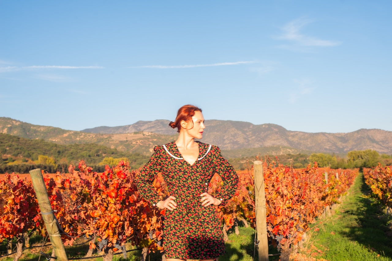El vestido Colette es una pieza cerrada tipo cruzado con un encantador estampado de flores rojas, mangas largas y un delicado detalle de encaje en el cuello.